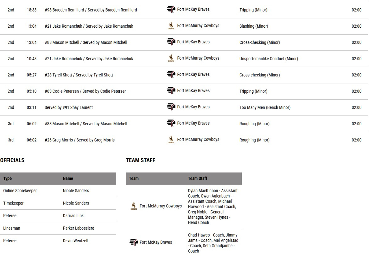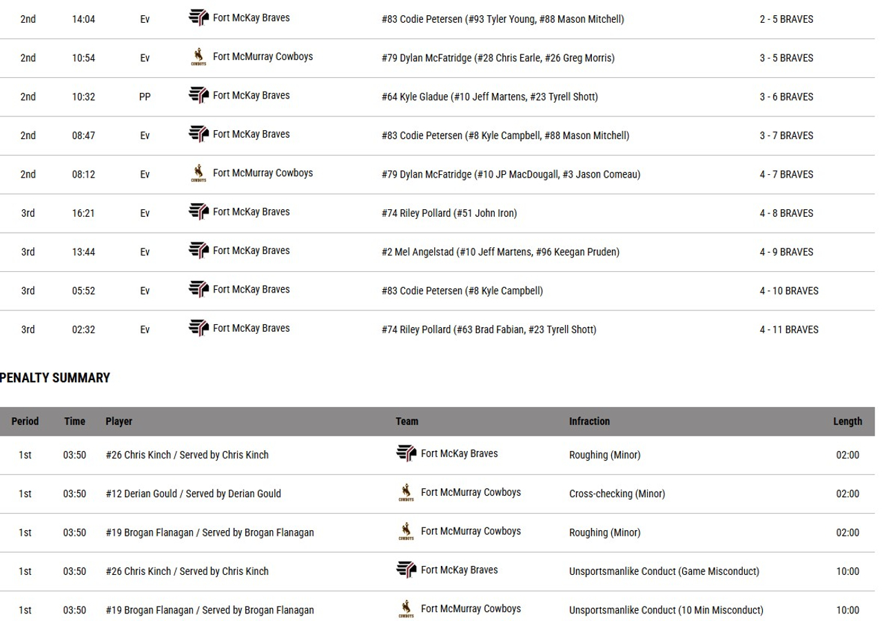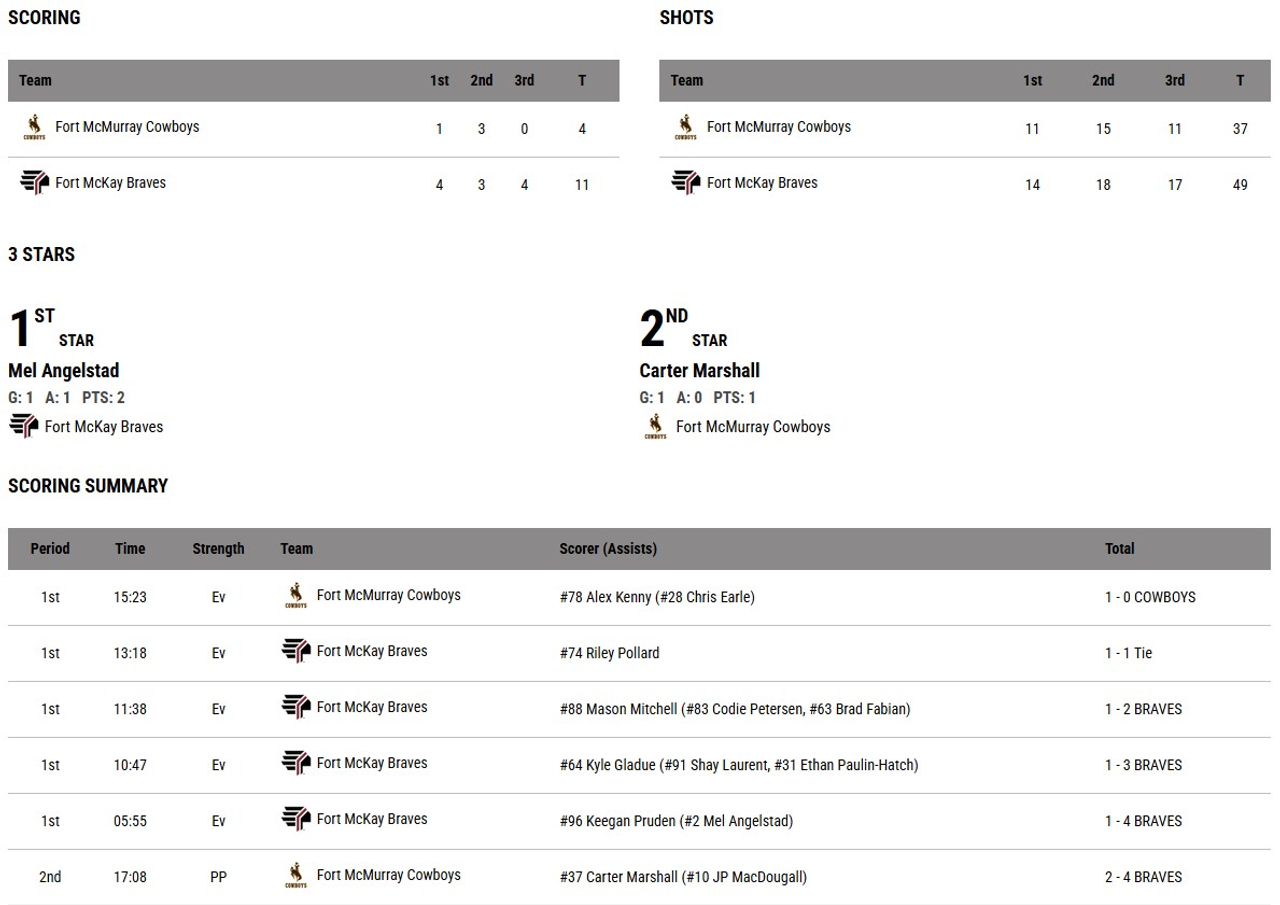 Fort McMurray opened the scoring with a Dylan McFatridge goal, but the Braves quickly followed it up with 3 goals in 2:31 to take a commanding 4-1 lead into the first intermission.