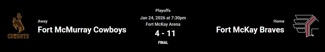 McFatridge recorded a hatrick for the Cowboys, who twice pulled within a 2-goal deficit in the 2nd period, only to surrender a goal back to Fort McKay 22 seconds later to make it 7-4.